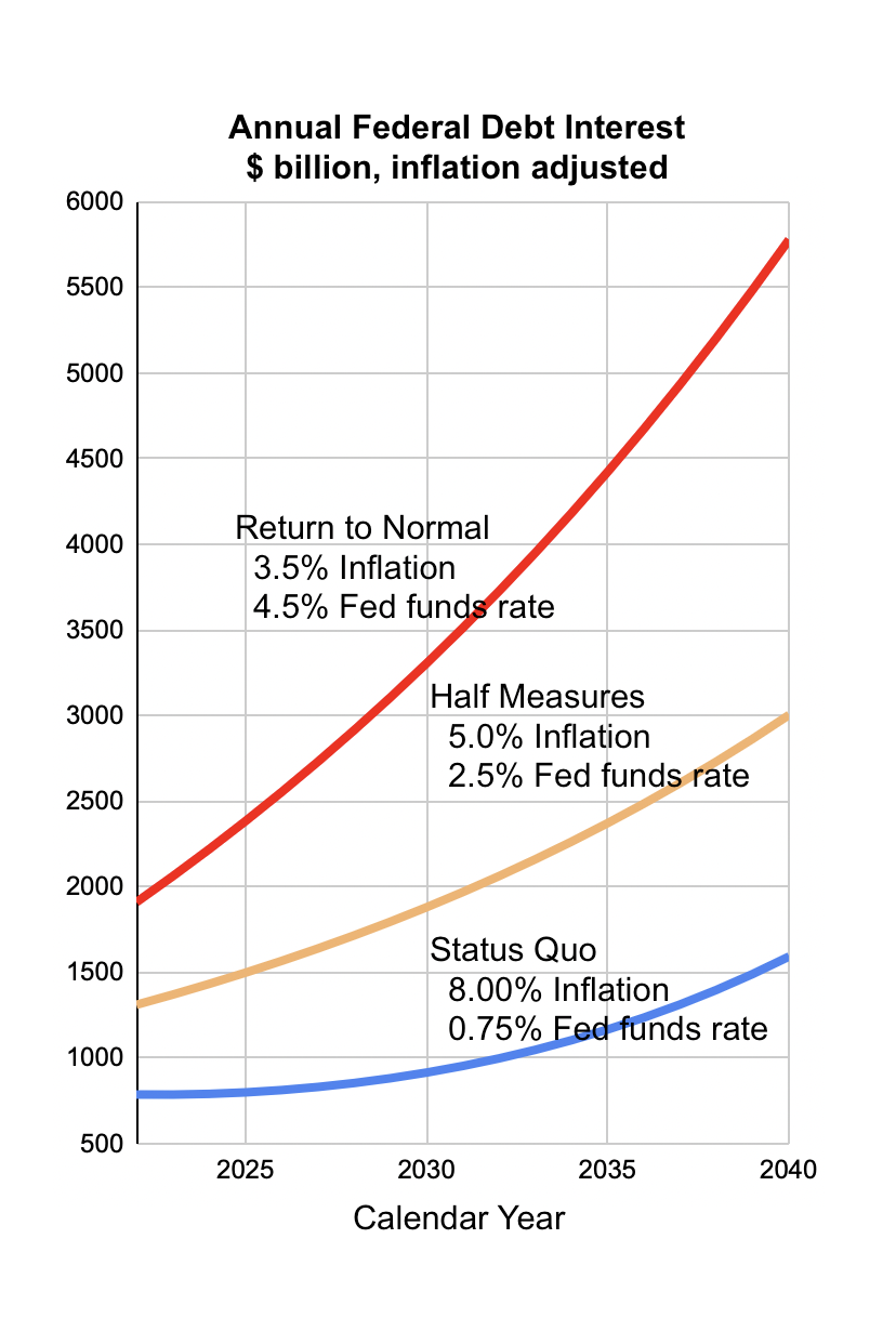 This direct purchase of federal government bonds obviously helps finance its debt. But the Fed also helps it by keeping the interest rates super low. Last year, the federal government paid a stunningly low $562 billion in interest on its enormous $30 trillion debt4. And this undermines the mission of the Fed. The more it raises rates to fight inflation, the more it creates problems for the federal government, which is dependent on those low rates. If the Federal funds rate returns to the historical average of 4.5 percent, debt payments will skyrocket, soon eating up every dollar of taxes the government receives. While the Federal Reserve is theoretically an independent agency, its chairman is appointed by the President and ultimately answers to Congress. Will it be willing to create enormous problems for its bosses? Consider three different scenarios. First, the Federal reserve can "return to normal", raising the federal funds rate to the historical mean of 4.5 percent, hopefully brining inflation down to the historical mean of 3.5 percent. At the other extreme, it can do nothing. It can leave the federal funds rate unchanged at today's crazy low 0.75 percent and let inflation stay high, let's say at 8.0 percent. A third option is to take a middle ground, raising rates to 2.5 percent but no further, hopefully holding inflation to a historically high (but maybe tolerable) rate of 5 percent. You can see the consequences of these three scenarios on federal debt payments in this graph. For simplicity, each scenario assume the approximately $2 trillion non-interest portion of the federal deficit grows only with inflation. The results are telling. If the Fed returns to normal, payments on the federal debt explode because interest rates are so high -- possibly causing a debt crisis. If the Fed does nothing and maintains the status quo, payments on the federal debt increase only slowly (in inflation adjusted dollars) because inflation erodes the value of the debt almost as quickly as deficit spending is adding to it. If the Fed takes the middle ground, the results are somewhere between the two extremes. Independent or not, expect the Fed to try to chart a middle ground. It will raise rates a bit, perhaps bringing inflation down to tolerable but still elevated levels. This may mean that interest rates will stay below inflation rate for years to come. (Sorry savers.) Some will complain this is a violation of the "dual mandate" of the Federal Reserve Reform Act of 1977, which requires the Fed to take action to seek both price stability and maximize employment. But the Fed will probably do it anyway, using creative interpretations to justify its actions. And the President and Congress will probably look the other way. By keeping The Federal Reserve as the chief enabler of deficit spending, politicians can keep popular government goodies flowing to their grateful constituents for several more years to come. Related Web Columns: He Didn't Start the Fire, April 19, 2022 Getting Away With It, October 19, 2019 Coming Drama, March 12, 2013 Living Like There's No Tomorrow, November 9, 2010 From America to Zimbabwe, March 24, 2009 Notes: 1. Bureau of Labor Statistics, Consumer Price Index for All Urban Consumers, as posted June 12, 2022 2. Federal Reserve Bank of St. Louis, Federal Funds Effective Rate, as posted June 12, 2022 3. Federal Reserve, Factors Affecting Reserve Balances, June 9, 2022 4. Voice of America, US National Debt tops $30 Trillion for First Time in History, February 3, 2022 |