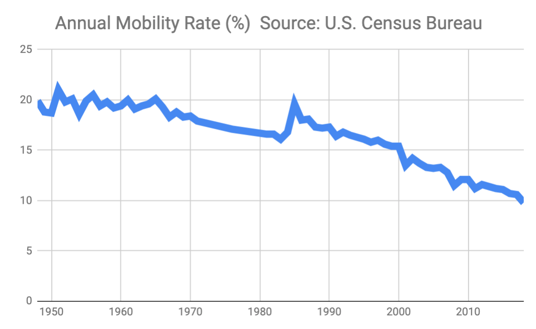 This is important because much of the nativist sentiment that drives America's hard-line border policy comes from the Trump Administration's political base of disaffected industrial workers. Instead of agitating for government action to return to industrial greatness, why don't they simply migrate to areas of greater opportunity? This is exactly what many of their ancestors did in migrating from Europe or American farms in the late 19th and early 20th century. It's the same thing that Central Americans are doing now. Many theories have been offered to explain America's falling mobility rate, much of it related to economic change. During the industrial era, large new factory openings might require thousands of assembly line workers. Workers recruited family and friends to join them en masse in new communities. But automation has cut the density of people needed to build products, requiring less migration. What's more, economist Timothy Taylor notes that cities are actually less specialized than they used to be.2 Steel workers once flocked to Pittsburgh or Gary, while automotive workers moved to Detroit. Today's service industries are less concentrated--cell phone shops, call centers and warehouses exist in cities across America. There is no point in moving to another city to get a job when that same job is available close to home. But often the same job in a different city pays much more, espeically in America's booming coastal cities. San Francisco and Washington DC now have median household incomes over $100,000 per year--nearly double the income of poorer cities like Tampa and Detroit.3 And while the disparity within these rich cities has opened a gulf between knowledge workers and the rest, governments have responded by boosting minimum wages to $14-$15 in the case of the leading cities mentioned while they lag at. $6-$9 in the trailing cities. Without question, people working the same jobs in these cities make more money. The drawback is higher living costs--especially high housing costs take a big bite out of these wages. Low income workers must live in group houses to make ends meet--that's what the cities' students and international immigrants do. And it is also exactly what many people did in America's earlier waves of migration. Not everybody is willing to do that. Most Americans want to live in a big house close to family and friends. A study by the Federal Reserve Bank of New York found that the average person today would forgo 30 percent of his or her income in order to remain close to home.4 It's a good bet, though, that people 50 years ago felt the same way. What has changed is that Americans today have much, much higher incomes. Disposable income per capita adjusted for inflation has quadrupled since 1960.5 Back then, moving vs. not moving could be the difference between having food on the table and going hungry. The number one reason Americans' won't move today is because they can get by without doing so. A 2016 Bloomberg study found that Social Security disability claims are highly concentrated in economically depressed areas like Appalachia and the Great Lakes regions, growing from serving 2.5 percent of Americans nationally in 1990 to 5.2 percent in 2015.6 The highest growth rate in claims was for neuroskeletal and connective tissue disorders--a category that includes easy to diagnose but hard to disprove chronic back pain. Why move for a job when Uncle Sam will pay you to live near family and friends in your downtrodden hometown? Clearly not all nativist Americans are poor homebodies living on the dole. But statistics do show that most Americans have lost that very gumption that played a huge part in making America great. The fact that many can't even respect this admirable quality in people crossing our southern border is perhaps the saddest development of all. Notes: 1. US Census Bureau, Annual Geographical Mobility Rates, By Type of Movement: 1948-2018, as Posted July 2, 2019 2. Planet Money, Americans Are Moving Less Than They Used To. Don't Blame The Recession, December 11, 2012 3. US Census Bureau, iHousehold Income: 2017, September 2018 4. City Lab, Why Some Americans Won't Move, Even for a Higher Salary, May 30, 2019 5. Bureau of Economic Analysis, Real Disposable Personal Income, historical figures as posted June 17, 2018 6. Bloomberg.com, Mapping the Growth of Disability Claims in America, December 16, 2016 |